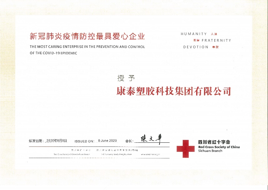 2020.11康泰集團榮獲四川省“新冠肺炎疫情防控最具愛心企業(yè)”稱號近日,為表彰康泰塑膠科技集團在新冠疫情防控工作中的突出貢獻,四川省紅十字會授予集團“新冠肺炎疫情防控最具愛心企業(yè)”榮譽稱號。2020年1月,正當全國人民喜迎新春佳節(jié)時,一場突如其來的新型冠狀病毒肺炎疫情肆虐中華大地。面對新型冠狀病...閱讀人數(shù):7703 -